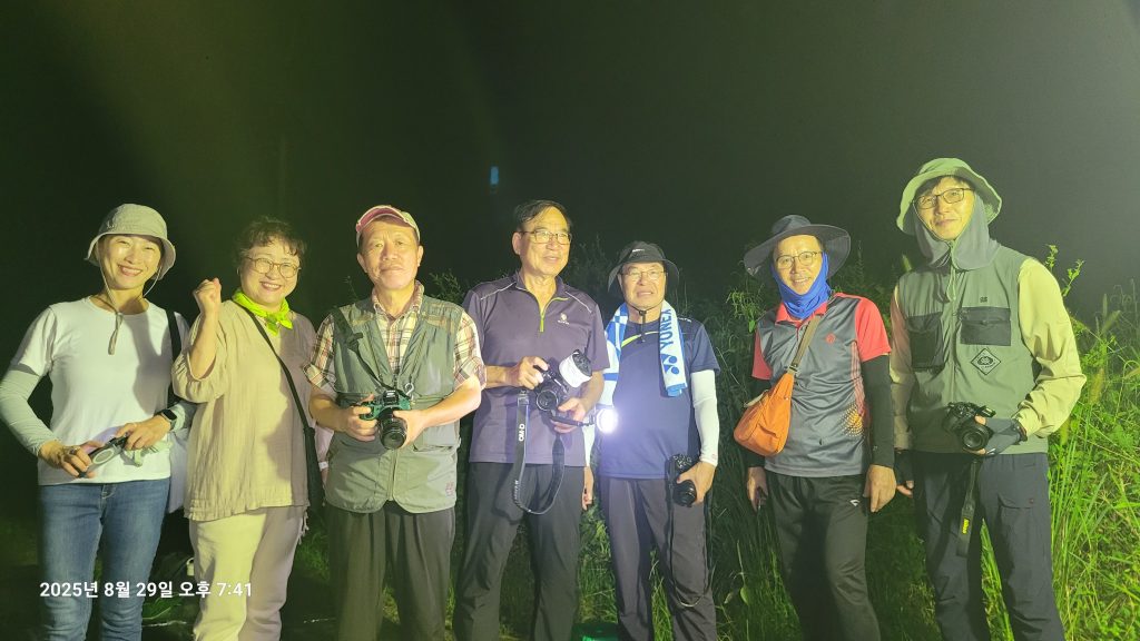 2025년 8월 29일날 저녁 조신일 박사님 주관으로 열린 야간곤충 탐사 다녀왔습니다. 박사님들과 함께 정정호, 권미자, 정보영, 그리고 저 용반디가 함께 참여했습니다. 그런데 불행히도 중간에 쏘나기가 내려서 탐사가 힘들었어요. ㅜㅜ 그래도 끝까지 현장을 떠나지 않고 박사님 네 분께서 열심히 탐사하는 모습을 옆에서 구경하였습니다.